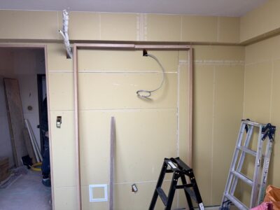 テレビを壁掛けにしたいとのご依頼で、まずは壁の下地を確認。